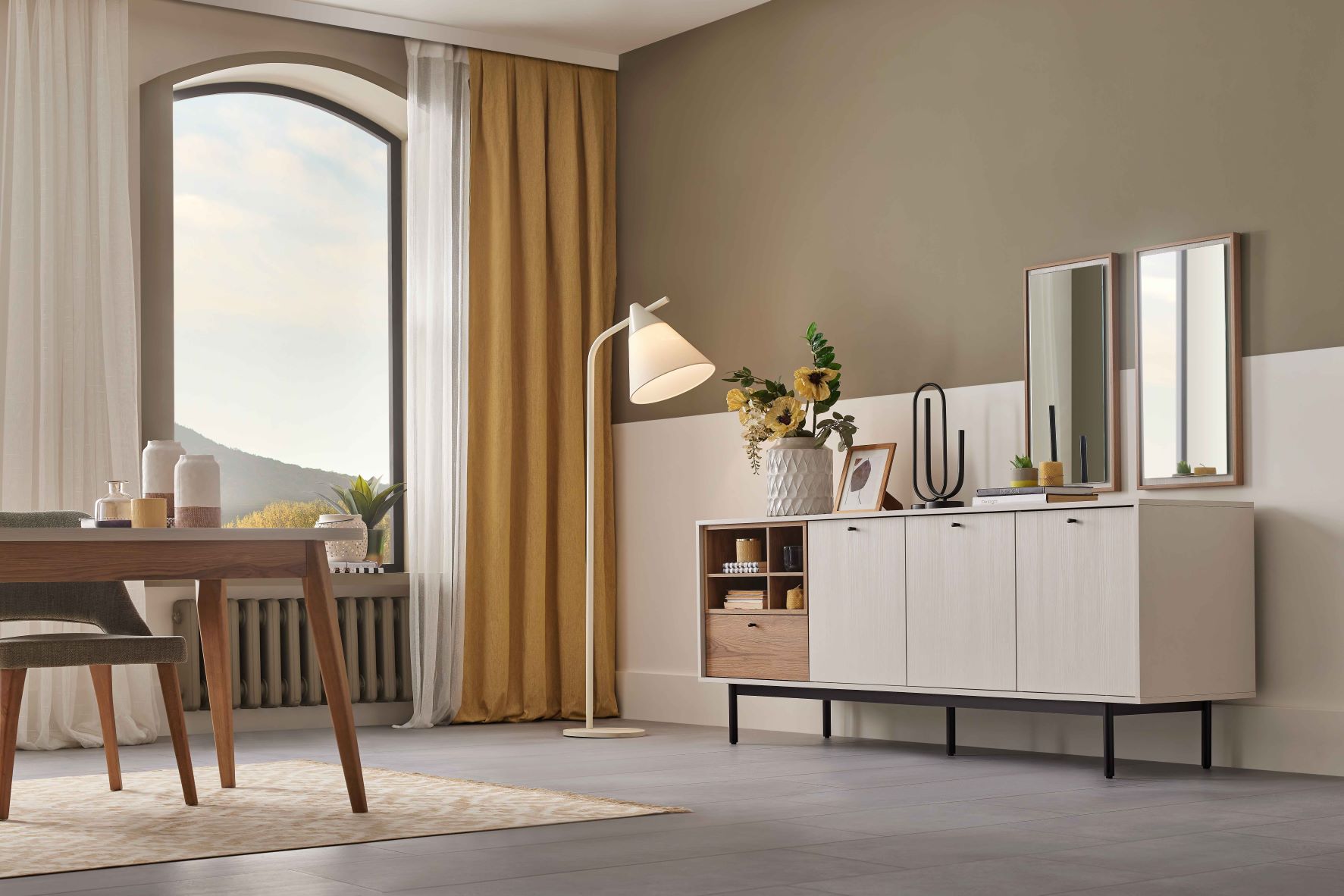 Bir mobilyadan daha fazlasını arayanlara benzersiz tasarımlar sunan Enza Home’un en yeni koleksiyonlarından biri olan Loreto Serisi, modern endüstriyel bir stilin evlerdeki yansıması oluyor. Yalınlığın zarafetini yansıtan, dinamik bir tarza sahip Loreto Yemek Odası, incelikli detaylarıyla göz alıyor. Açık ceviz ve kırık beyaz renk kombinasyonu ile öne çıkan derin dokulu yüzeyler tasarıma özgün bir yorum katıyor. Metal mat siyah kulp ve ayak uygulaması da zarif bir detay olarak öne çıkıyor. 2 farklı ayak tasarımına sahip açılır ve sabit olmak üzere 4 masa alternatifi bulunan Loreto Yemek Odası’nın profil detaylı konsol aynası seti, çok amaçlı çekmece bölümü ve dekoratif raflarıyla estetiği fonksiyonellikle buluşturuyor.