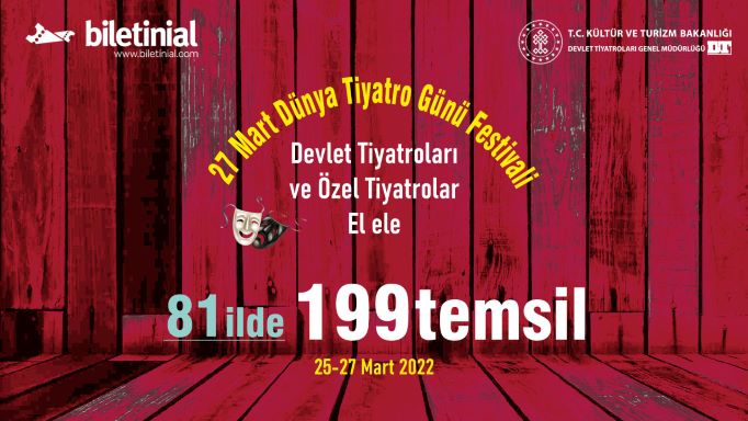 Dünya Tiyatrolar Günü ülkemizde bu yıl ilk defa ‘Tiyatro izlemeyen kalmasın’ sloganıyla festival havasında kutlanacak. 3 gün boyunca 81 ilde, 17’si çocuk temalı olmak üzere 199 tiyatro gösterisi perdelerini tiyatroseverler için sembolik ücretlerle açacak. Türkiye’nin teknoloji odaklı etkinlik biletleme platformu Biletinal da festivali teknolojisi ile destekleyecek. Dünya Tiyatro Günü tam 61 yıldır aralıksız olarak kutlanıyor. Dünya çapında kutlanan bu özel günde, birçok sanat grubu ve tiyatro, kapılarını izleyicilerine büyük bir coşkuyla açıyor. Bu yıl Dünya Tiyatrolar Günü ülkemizde çok daha etkin bir şekilde kutlanacak. T.C. Kültür ve Turizm Bakanlığı’nın girişimiyle, Kültür ve Turizm Bakanlığı’na bağlı Devlet Tiyatroları ve özel tiyatroların işbirliği ile 27 Mart Dünya Tiyatrolar Günü kapsamında 3 günlük Tiyatro Festivali gerçekleştirilecek. Festival kapsamında tiyatro severler 25-27 Mart tarihlerini kapsayan 3 günde ve 81 ilde 17’si çocuk temalı olmak üzere 199 oyunu sembolik ücretlerle izleyebilecek.