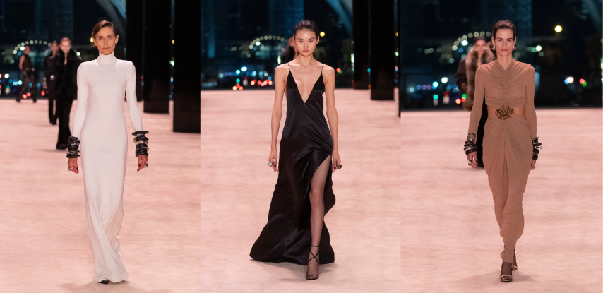 Ortaya koyulan silüet heyecanla tanımlanıyor: Yves Saint Laurent’in daha yoğun materyallerle tasarladığı dış giyimler, aşağı doğru daralan paletot tarzı paltolara dönüşüyor ve narin kumaşların kullanıldığı boru kesim elbiselerle kombinleniyor. Heyecan veren şeffaflık ışıltıları ve beklenmedik tarzdaki ayakkabılar, koleksiyona hafiflik katıyor. Güçlü omuzlar için hacim artırılırken, ince uzun görünüm; gümüş, altın ve bronz bileziklerden oluşan gösterişli mücevherlerle kesintiye uğruyor.