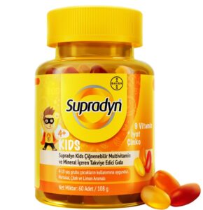 Supradyn Ailesi’nin merakla beklenen yeni üyesi Supradyn Kids, 9 vitamin (Vitamin C, Vitamin E, Vitamin B3 (Niasin), Biotin, Vitamin A, Vitamin B12, Vitamin D, Vitamin B6 (Pridoksin), Vitamin K), iyot ve çinko içeriyor. İyot, çocukların normal büyümesine katkıda bulunuyor.