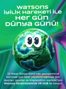 Bir deneyim markası olan Watsons, #WatsonsİyilikHareketi kapsamında sanal gerçeklikle hazırladığı www.watsonsgogreen.com/vr-tr isimli Sürdürülebilirlik VR Hub deneyim platformunda, sürdürülebilirlik konusunda bilgilendirici içerikleri ve ipuçlarını eğlenceli bir şekilde müşterilerine sunuyor. Okyanus, Dünya, Orman, Watsons Sürdürülebilir Yaşam ve Dünya Günü odalarından oluşan deneyim platformunda doğayı korumak ve daha sürdürülebilir bir dünya yaratmak için önemli bilgilerin yanı sıra eğlenceli oyunlar ve testler yer alıyor. Proje kapsamında Instagram sayfasında da özel bir filtre oluşturan Watsons, filtrede bulunan bilgilendirici mesajlarla farkındalık sağlamayı hedefliyor.
