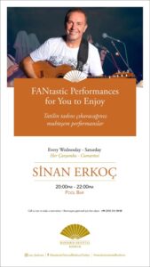 Tatile keyif ve eğlence katan özel etkinlikler de sunan Mandarin Oriental, Bodrum, sezon boyunca canlı müzik ve barbekü geceleri düzenliyor. Her salı ve cuma Mandarin Bar’ın eşsiz manzarasına karşı 21:00 – 23:30 arası sevilen müzisyen Aymila Taşçı sahne alırken, her çarşamba ve cumartesi ise ünlü müzisyen Sinan Erkoç Pool Bar’da 20:00 – 22:00 saatleri arasında sevenleri ile buluşuyor. Müzik keyfine lezzeti de ekleyen Mandarin Oriental, Bodrum, Pool Restaurant’da barbekü sevenleri her çarşamba ve cumartesi çok özel bir meze seçkisi ile birlikte 19:30-21:30 arasında ağırlıyor.
