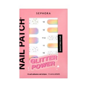 Glitter Power Nail Patchs sadece 5 dakikada tırnaklara dikkat çeken bir görünüm kazandırıyor. 13 farklı modeliyle trend ve yaratıcı tırnaklara imza atan bu sticker’lar kolay kullanımı ile de güzellik tutkunlarını mutlu ediyor. Canlı desenlerde, her boyuttaki sticker’lar, tüm tırnağı kaplarken kolayca şekillendirilip törpülenebiliyor. Daha parlak bir etki ve parlak bir son kat için bir kat Sephora Collection Top Coat uygulaması ile kullanılması tavsiye edilen ürün yapışkan – kalıntı bırakmıyor ve tırnaklara zarar vermiyor.