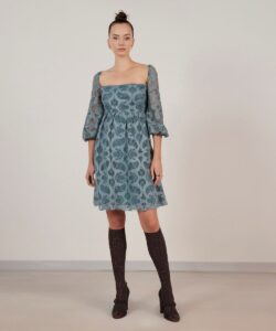 Mavinin muhteşem tonlarına bürünen bu özel elbise, hem gündüz denim ceket ve spor ayakkabıyla hem de gece simli triko ve topuklu ayakkabıyla şık ve rahat bir görünüm sunuyor. Bu eşsiz parça, özel bir teknikle üretilen dokulu dantel kumaş yapısıyla şehrin sokaklarında farklı stillere kolayca uyum sağlayacak birer seçenek oluyor. Şehirli kadınların dinamik temposuna ayak uyduran bu elbise, günlük hayatlarının yanı sıra özel anlarında şıklığından ödün vermeden öne çıkan özellikler sunuyor.