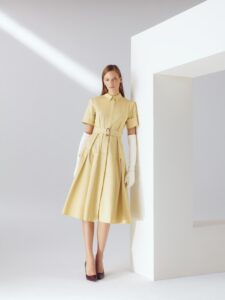 Lila ve yağ yeşilinin eklektik uyumunun eşsiz bir harmoni yarattığı koleksiyonda; transparan etkiyi güçlendiren dantel detaylı elbiselerin yanı sıra, drapajlı lila saten bluz, jakar ve fırfır detayıyla kendinden dokulu kumaşla tamamlayan siyah etek de bulunuyor.