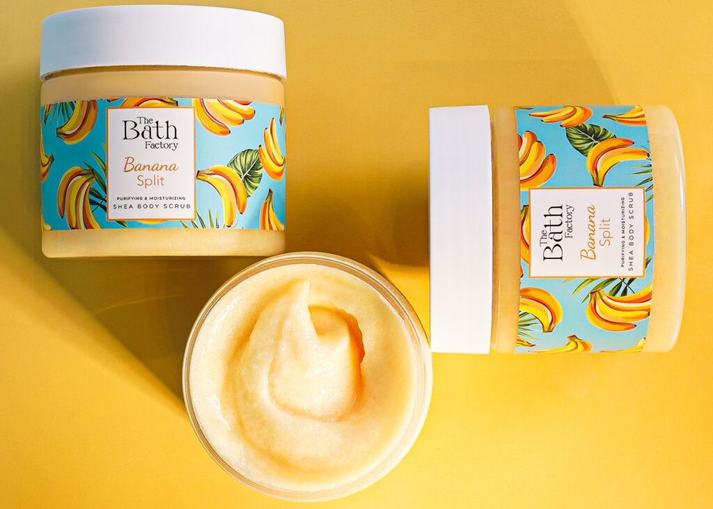 The Bath Factory Banana Split Shea Vücut Peelingi: Muzun mutluluk veren kokusuyla sizi çocukluk zamanlarınızda tatlı bir yolculuğa çıkaracak. %100 Vegan ve parafin içermeyen formülüyle güvenle kullanabileceğiniz bu peeling, cilt bakımında doğallığı ve etkinliği arayanların vazgeçilmezi olacak!