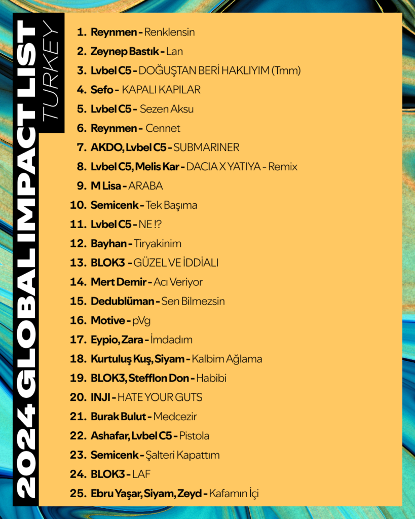 Spotify’ın açıkladığı liste, geleneksel arabesk müzik unsurlarını modern pop sound’larıyla harmanlayan arabesk popun sadece Türkiye’de değil, global arenada da ne kadar büyük bir hayran kitlesine sahip olduğunu ortaya koyuyor. 2024’ün ilk yarısında çıkış yapan Reynmen’in Renklensin parçası Türkiye dışında aynı dönemde en çok dinlenen şarkı olurken, onu Zeynep Bastık’tan Lan takip etti. Listeye giren diğer bazı şarkılar ise Sefo’dan Kapalı Kapılar, Semicenk’ten Şalteri Kapattım, Mert Demir’den Acı Veriyor Dedublüman’dan Sen Bilmezsin, Kurtuluş Kuş ve Siyam’dan Kalbim Ağlama, Burak Bulut  Medcezir oldu.