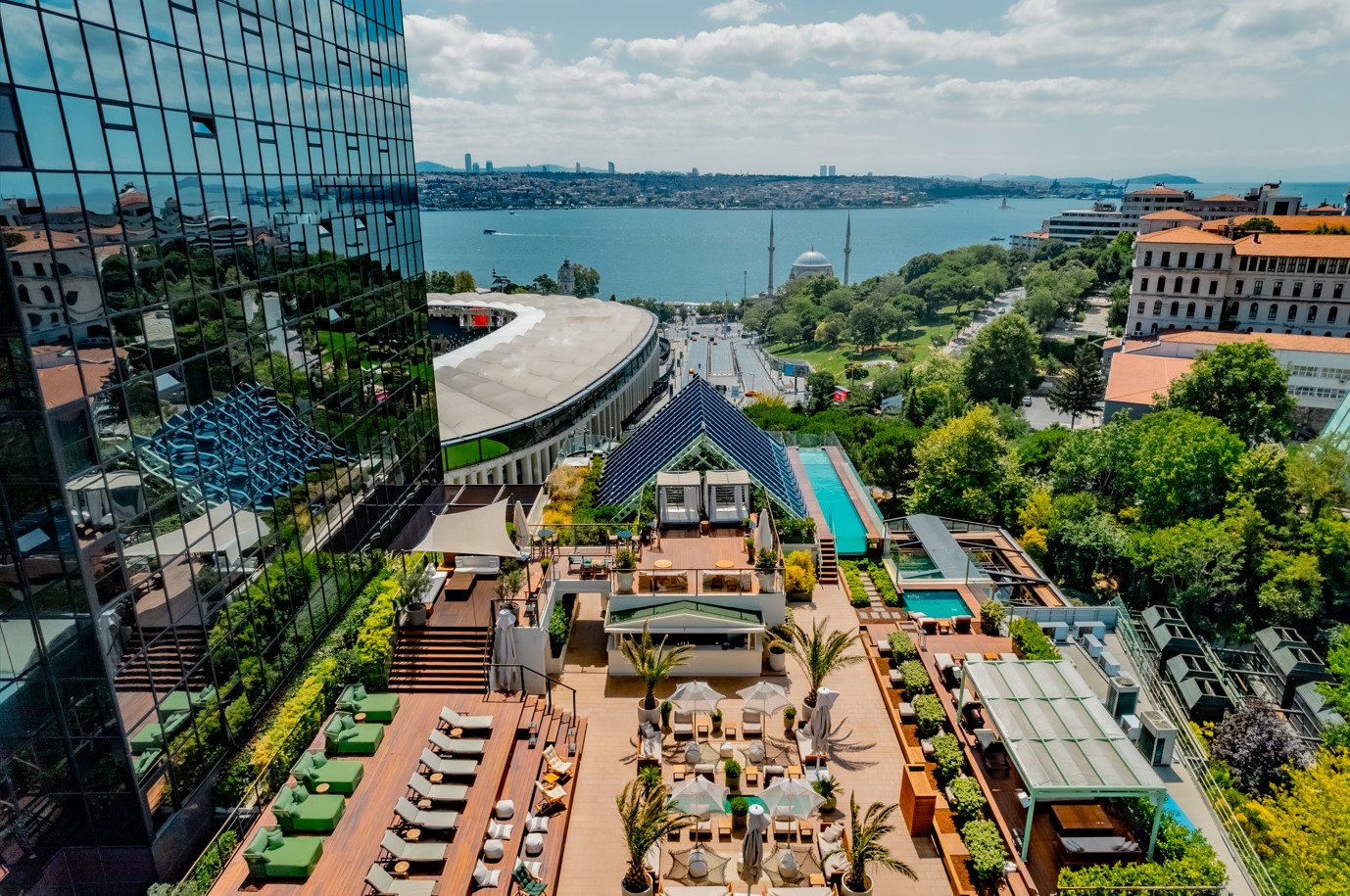 Şehrin kalbindeki lokasyonuyla bir dinginlik ortamı sunan The Roof at The Ritz-Carlton, Istanbul geniş açık alanı, güneşlenme bölümleri,