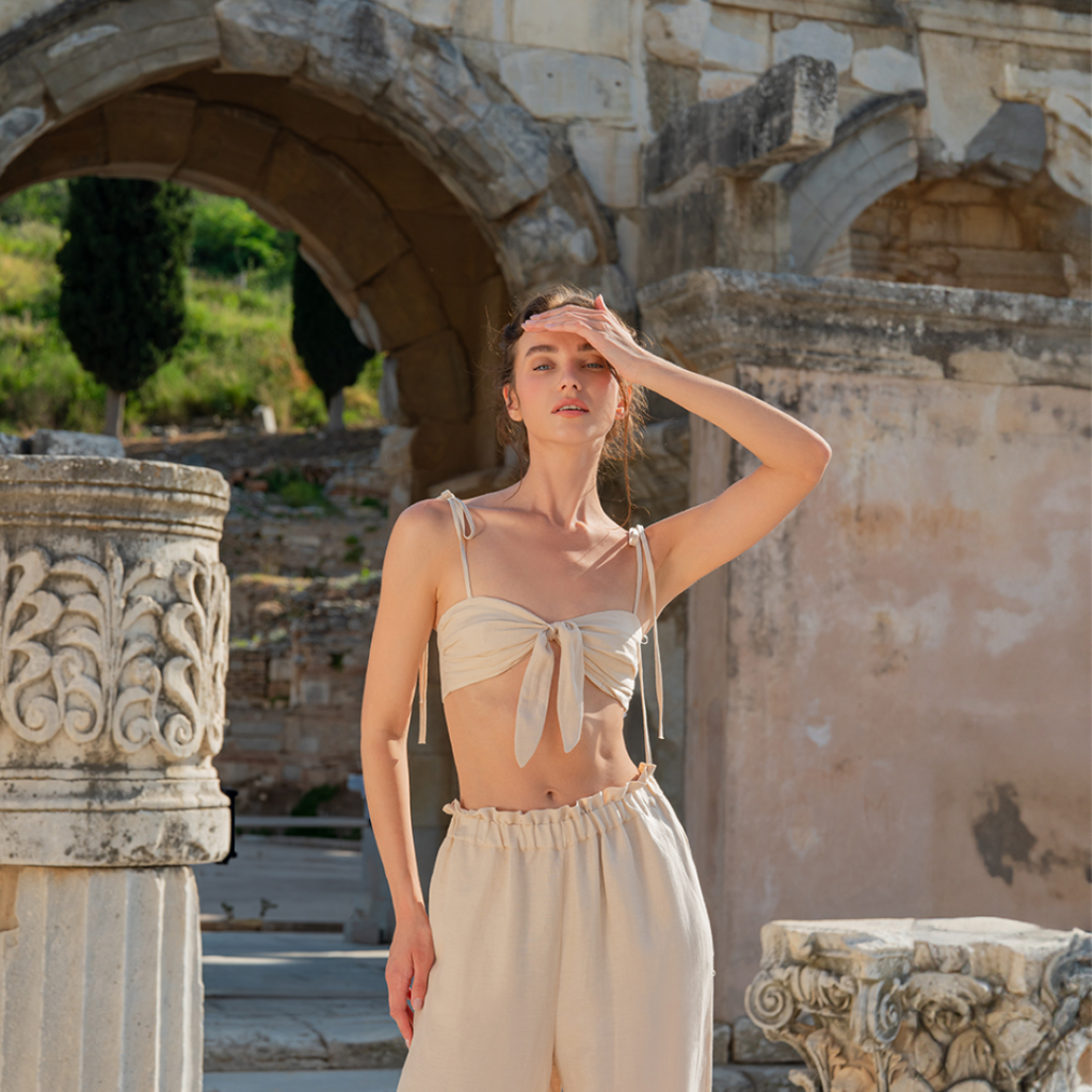 Hera Bust, Efes’in mistik ruhunu yansıtıyor. Asimetrik sırt dekoltesiyle öne çıkan bu parça, adeta büyülü bir cazibe sunuyor. Hera Maxi Dress ise antik dönemlerin atmosferini yeniden yorumluyor. Omuz ve sırt bölgesindeki detaylar, elbiseye kendine has bir karakter yaratıyor. Her ortama uyum sağlayan bu elbise, tarzınıza yenilikçi bir sitil sunuyor.