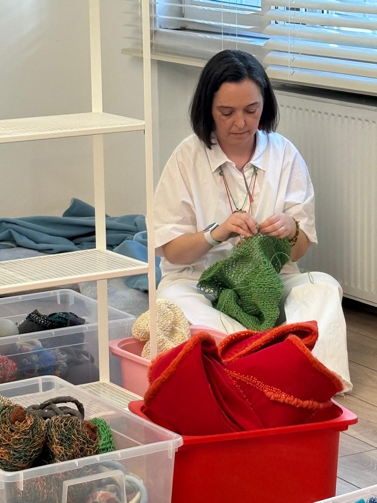 Sergi, “dokunulabilir” ve “yerinden oynatılabilir” nesnelerle dolu bir oyun alanı sunuyor. Boncuklarla kaplı kumaşlar, esneyip bükülebilir örgü vazo formları, ses çıkaran halkalar, örülmüş ve bozulabilir yapılar… Her biri boşlukta zaman, hafıza ve etkileşimle şekillenmeye açık. Ziyaretçiler, sergilenen nesnelerin yerini değiştirebilir, onlara dokunabilir, hatta onlarla müzik dahi yapabilir.