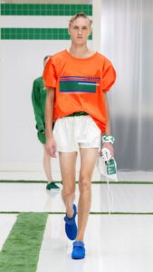 Duyusallık, tamamlanmamış siluetler ve vintage spor giyim esintileriyle yeniden harmanlanan atletik miras, bu sezonun zarif ama dinamik gardırobunun temelini oluşturuyor: transparan pololar; parlak deriden iddialı parçalar; üzerinde “Tennis for Everyone” yazılı sabahlığı andıran trençkotlar; yüksek teknoloji ipeksi dokulardan yapılmış hafif ve akışkan naylon parçalar – işlevsel estetiğe sahip kauçuk kaplamalı pamuk ve ıslak görünümlü naylonla buluşarak güçlü bir karşıtlık yaratıyor.