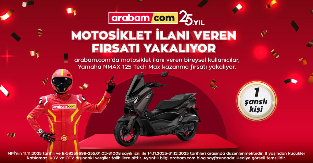 Türkiye’nin otomobil dikeyinde ilk online ilan platformu arabam.com, kullanıcılarına yeni çekiliş kampanyasını duyurdu. 14 Kasım – 31 Aralık 2025 tarihleri arasında arabam.com üzerinden motosiklet ilanı veren bireysel kullanıcılar, çekilişle 2025 model Yamaha NMAX 125 Tech Max motosiklet kazanma fırsatı yakalıyor.