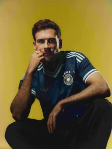 Almanya iç saha formasının görsel dilini sürdüren tasarımda diyagonal şevronlar, lacivert tonlarında tüm yüzeye yayılan bir desen olarak yeniden yorumlanıyor. Birbirine geçen üç formdan oluşan ritmik yapı, DFB tarihinin farklı dönemlerinden ilham alan renk paletiyle tamamlanıyor. 1954 yılında giyilen klasik mavi çeyrek fermuarlı üstlere gönderme yapılırken; 60’lar, 70’ler ve 80’lerin ikonik mavi-beyaz antrenman üstleri referans alınıyor. Aqua mavi detaylar, 90’ların renkli antrenman giyiminden ilham alıyor. Formanın etek kısmında yer alan zarif bayrak etiketi, adidas ve Almanya arasında 1954’ten bu yana süregelen iş birliğini simgeliyor.