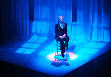 Yazar Cansu Ermiş Akalp Mavili, sisli, puslu bir salonda tek bir tabure. Koca bir sahnede tek bir tabure.